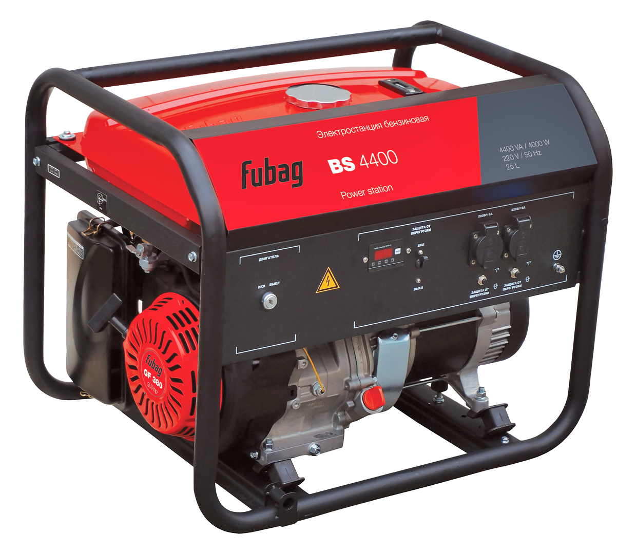 Официальный дилер Fubag. Мощный и экономичный двигатель Электростанция для электроснабжения “с запасом” в доме или на даче.Оборудована мощным и экономичным четырехтактным двигателем с верхним расположением клапанов. Станция оснащена автоматическим декомпрессором, облегчающим запуск. Рама станции имеет подготовку для установки опционального транспортировочного комплекта Fubag: Колеса и ручки, шифр 568286 Проста в эксплуатации и обслуживании, может использоваться для организации резервного энергоснабжения загородного дома, а также для эпизодической работы в мастерской или на стройплощадке. Может использоваться в качестве резервного источника электроэнергии в загородном доме, её мощности достаточно для работы большинства бытовых электроприборов и циркуляционных насосов систем отопления. Оснащена тремя розетками на 220 В (16 А), что позволяет одновременно подключать несколько потребителей. Работа без дозаправки до 12 часов Вместительный 25-литровый топливный бак обеспечивает длительную работу без дозаправки - до 12 часов при 75%-й нагрузке. Надежность конструкции Прочная стальная рама повышает надёжность конструкции, блок «двигатель-генератор» крепится к ней через резиновые амортизирующие элементы, что снижает уровень шума и вибрации. Контроль параметров работы Передняя панель русифицирована и снабжена многофункциональным дисплеем, отображающим основные рабочие параметры – напряжение, частоту и число отработанных моточасов. Электростанция оборудована системой AVR, которая позволяет контролировать характер нагрузки и в зависимости от этого регулировать работу двигателя. Система защиты от перегрузки отключает двигатель при коротком замыкании, предотвращая его поломку.. Ремонт и обслуживание в авторизованном сервисном центре. Бесплатная техническая поддержка.