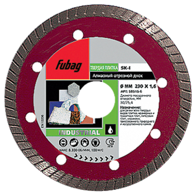 Отрезной алмазный диск Industrial SK-I Fubag 58615-6 используется при работе на плиткорезных станках. Диск служит для выполнения резов в керамической плитке, керамограните, твердом искусственном камне, пластике. Работа осуществляется только при наличии водяного охлаждения.Диски индустриальной программы различаются по ресурсу работы, который рассчитывается в теории и обозначается "алмазами" на упаковке. Данный диск имеет самый высокий (6 "алмазов") показатель теоретического ресурса в своем классе и виде обрабатываемого материала.Дополнительные характеристики:Высота сегмента 7 мм;Ширина сегмента 1.6 мм