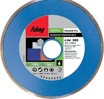 Официальный дилер Fubag. Отрезные алмазные диски Fubag Professional Keramik Pro предназначены для обработки всех видов плитки, тонких гранитных и мраморных плит, прессованного камня. Диски этой программы - лучший выбор для формирования постоянного ассортимента соответствующего отдела строительного супермаркета или специализированного магазина. Маркировка дисков программы Professional включает обозначение обрабатываемого материала и условное обозначение линейки, например: Keramik Pro.. Ремонт и обслуживание в авторизованном сервисном центре. Бесплатная техническая поддержка.