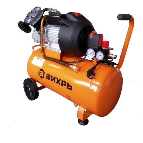 Компрессор КМП-400/50 от производителя Вихрь необходим для подключения различного оборудования работающее со сжатым воздухом, который будет надежным помощником в ремонте и строительстве. Этот компрессор поршневого типа, оснащен мощным двигателем 2500 Вт и вырабатывает 24000 литров в час под давлением 8 бар, объем бака 50 литров. Также на нем установлены манометры, один из которых контролирует давление непосредственно компрессора, а другой выходное давление – оно устанавливается специальным регулятором.