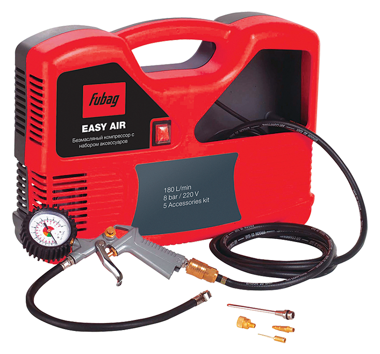 Официальный дилер Fubag. Переносной безмасляный компрессор служит для снабжения пневмоинструментов чистый сжатым воздухом. Наше широкое применение в ремонте и домашнем использовании. В корпусе есть отсек для хранения шланга, пистолета, шнура. На внутренней поверхности крышки, закрывающей полость для хранения аксессуаров, имеются фиксаторы для хранения насадок. Крышка внутренней поверхности оборудована специальными кронштейнами для размещения всех необходимых насадок. В набор входят:воздушный шланг, 3 м;пистолет для накачки шин;насадка для надувки мячей;насадка для накачки матрасов;насадка для накачки велосипедных колес.. Ремонт и обслуживание в авторизованном сервисном центре. Бесплатная техническая поддержка.