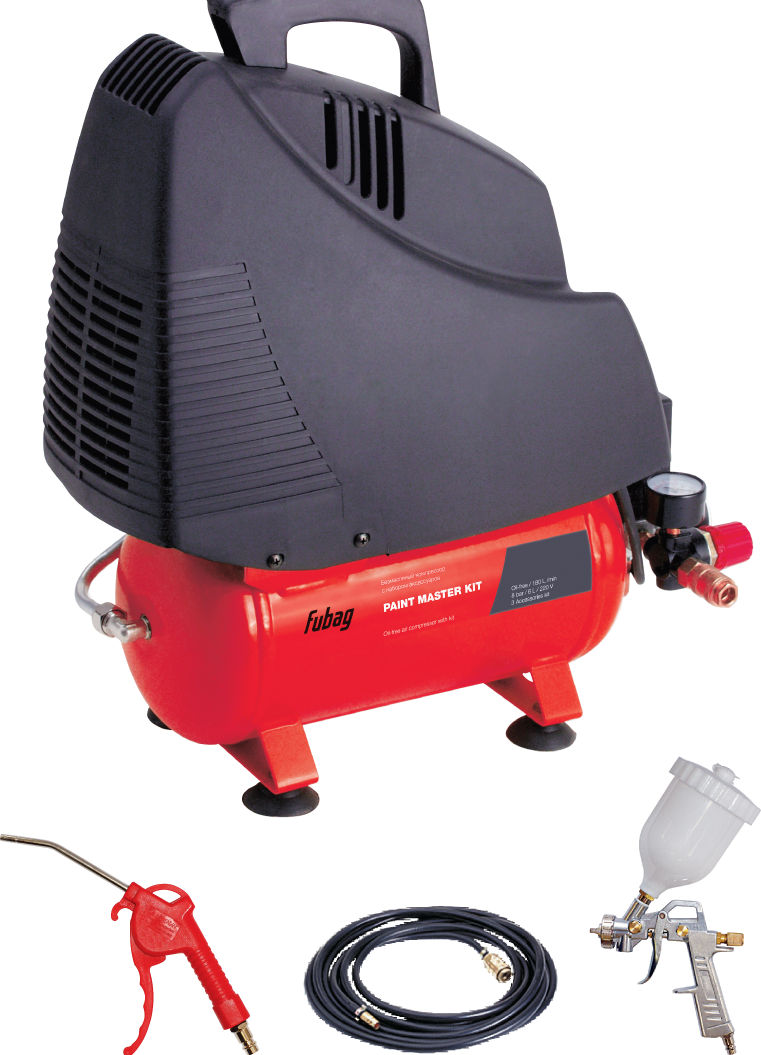 компрессоры Fubag серии MASTER KIT (безмасляные)Все компрессоры линейки – коаксиальные. Однако данная линейка представлена как масляными, так и безмасляными компрессорами. Безмасляная группа представлена широким ассортиментом. Друг от друга каждая модель отличается наличием или отсутствием либо объемом ресивера; но главные отличия – в комплектации, подобранной в зависимости от сферы применения каждого компрессора: FUBAG HANDY MASTER KIT Основное предназначение – работы в быту, мелкий ремонт и обслуживание автомобиля. В комплект входит: пистолет для накачки шин с манометром; пистолет для продувки; три наконечника; насадка для продувки; соединительный резиновый шланг длиной 5 м с быстроразъемными соединениями.FUBAG SERVICE MASTER KIT Применяется для обслуживания техники, как офисной, так и бытовой. Комплектация: пневмопистолет для накачки шин с манометром; пневмопистолет для продувки; пневмопистолет для продувки и мойки; комплект из трех наконечников; насадка для продувки; гибкий спиральный шланг длиной 5 м с быстроразъемными соединениями.FUBAG PAINT MASTER KIT Создан для покраски различных поверхностей и материалов. Комплект включает: краскораспылитель HP с верхним бачком объемом 0,5 л; аэрограф с двумя сменными бачками; соединительный резиновый шланг длиной 5 м с быстроразъемными соединениями.FUBAG WOOD MASTER KIT Комплектация позволяет применять данный аппарат в качестве мощного пневмопистолета: гвоздезабивной пистолет для гвоздей до 50 мм; два набора гвоздей по 1000 шт.; гибкий спиральный шланг длиной 10 м с быстроразъемными соединениями.FUBAG HOUSE MASTER KIT Существенно увеличенный объем ресивера позволяет укомплектовать компрессор любыми дополнительными опциями, что позволяет применять аппарат в любой из сфер: для дома, для офиса, для СТО, в гараже, на даче или на природе, список можно продолжать безконечно. В основной же комплект входят наиболее широко применяемые элементы: краскораспылитель с верхним бачком на 0,5 л; пистолет с манометром для накачки шин; комплект из трех наконечников; насадка для продувки; гибкий спиральный шланг длиной 5 м с быстроразъемными соединениями.Каждая модель характеризуется двумя основными параметрами: •коаксиальные•безмасляныеПо типу привода компрессоры данной линейки относятся к коаксиальным, говоря простым языком: они оснащены двигателем с прямым приводом. Что несет ряд преимуществ. Производительный. Обладая прямым приводом, они не оснащаются теми деталями, которые приводят к потере мощностей, а так же удорожанию всей конструкции. Так же, при изготовлении компрессора с коаксиальным приводом, используются исключительно антифрикционные материалы, то есть те, которые признаны наиболее износоустойчивыми, что и продлевает срок службы аппарата. Многие «обвиняют» коаксиальные компрессоры в низком уровне шумоизоляции, поэтому при покупке важно учесть такую особенность и обратить особое внимание на уровень шума компрессора. Тем не менее, данный недостаток компенсируется минимальными габаритами и весом; работая в небольших помещениях, габариты оборудования часто играют не мало важную роль. Каждый из компрессоров этой линейки оснащен пластиковым кожухом, благодаря чему увеличивается скорость охлаждения всего компрессора, таком образом защищая аппарат от перегрева.Главной отличительной чертой данных компрессоров является отс