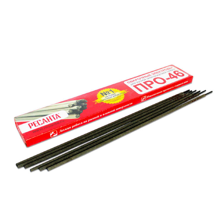 Электрод Ресанта ПРО-46, Ф4,0 Пачка 3кг. Сварочные электроды РЕСАНТА предназначены для ручной дуговой сварки стальных конструкций переменным или постоянным током. Данные электроды могут применяться как в быту, так и для сварки ответственных конструкций из углеродистой стали с массовой долей углерода до 0,25%. Сварка возможна в различных пространственных положениях, кроме сварки на спуск. Электрод представляет собой металлический стержень из электропроводного материала, предназначенный для подвода тока к свариваемому изделию.