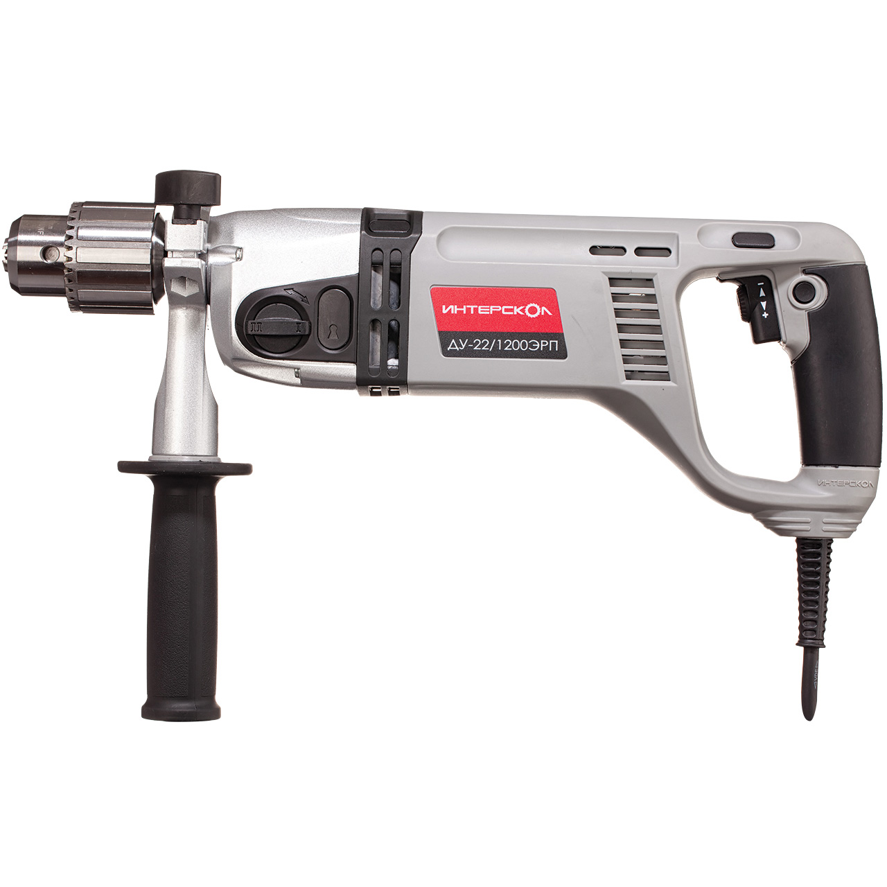 Профессиональная двухскоростная ударная дрель ДУ-22/1200ЭРП Интерскол номинальной мощностью 1200 Вт, количество оборотов на 1 ступени достигает 1000 об/мин, на второй - 2000, а ударов на 1 ступени - 16660, на 2-й - 34000 сверло для этой дрели подходит диам. 1 - 16 мм. Дрель удобна в использовании, благодаря эргономической конструкции, прорезиненной рукоятки, вспомогательной ручки и простотой эксплуатации, также облегчает выполнение задач, расположенный на корпусе фиксатор кнопки для длительных работ. В ней имеется возможность смены направления вращения, а также плавное регулирование оборотов. Эта дрель будет отличным помощником для дома и для ремонтных бригад.