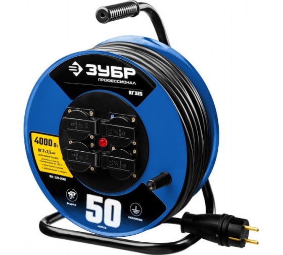 Удлинитель на катушке ЗУБР "КГ 325", 50 м, 4000 Вт, 4 гнезда, IP44, КГ 3х2,5 кв мм, 55079-50 служит для подачи электричества для приборов, которые расположены на расстоянии от стационарной розетки. КГ кабель позволяет применять удлинитель на улице, в производственных помещениях или на стройках. Удобство в эксплуатации обеспечивает мобильность перемещения за счет прорезиненной эргономичной рукояти.